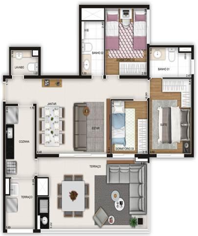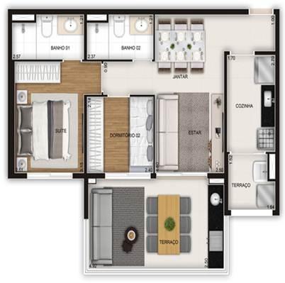 - Com ambientes bem distribuídos e plantas inteligentes, os apartamentos possuem 64 m² e 94 m², 2 e 3 dormitórios e 1 ou 2 vagas de garagem, terraço com churrasqueira integrado à cozinha, o que garante praticidade ao dia a dia.