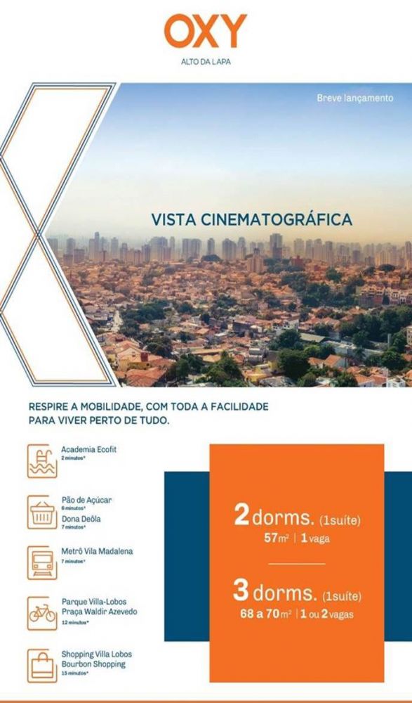 - Respire a mobilidade, com toda a facilidade para viver perto de tudo, Oxy Alto da Lapa apresenta plantas de 57 m² com 2 dormitórios (1 suíte) com 1 vaga de garagem ou planta de 75 m² com 3 dormitórios (1 suíte) com 2 vagas de garagem.