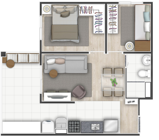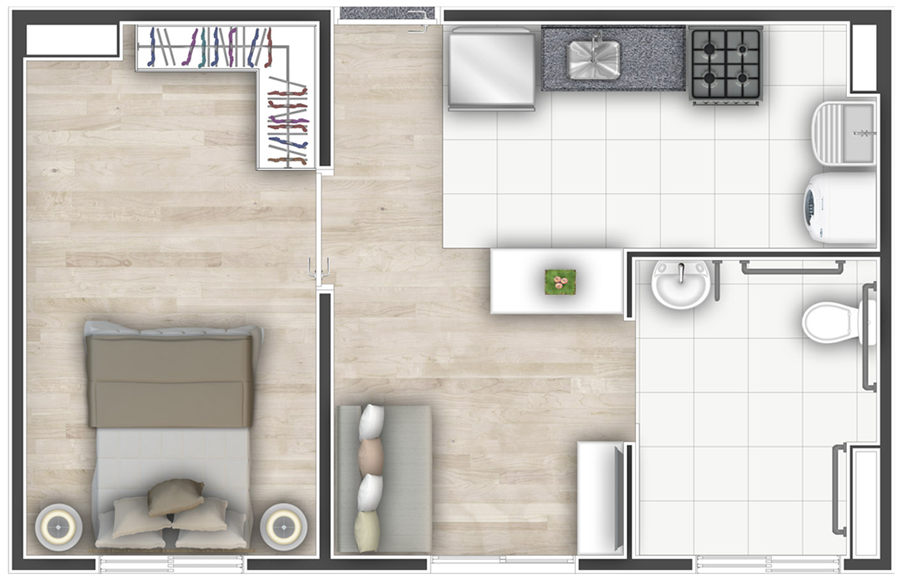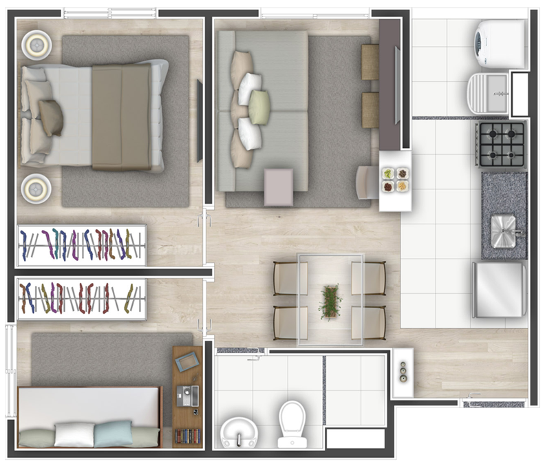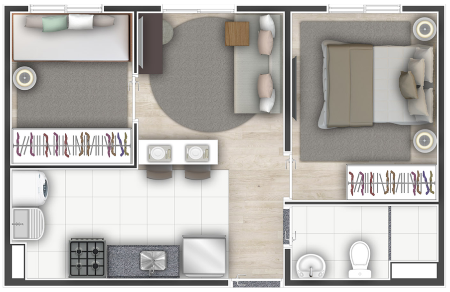 • O Mobi One apresenta plantas de 2 dormitórios de 33 a 47 m², além de plantas com possibilidade de adaptação para portadores de necessidade especial (PNE).