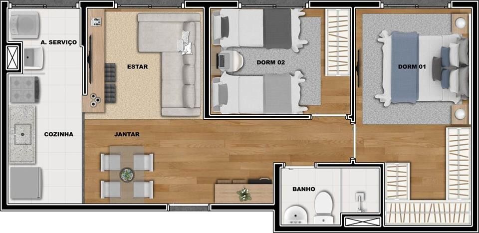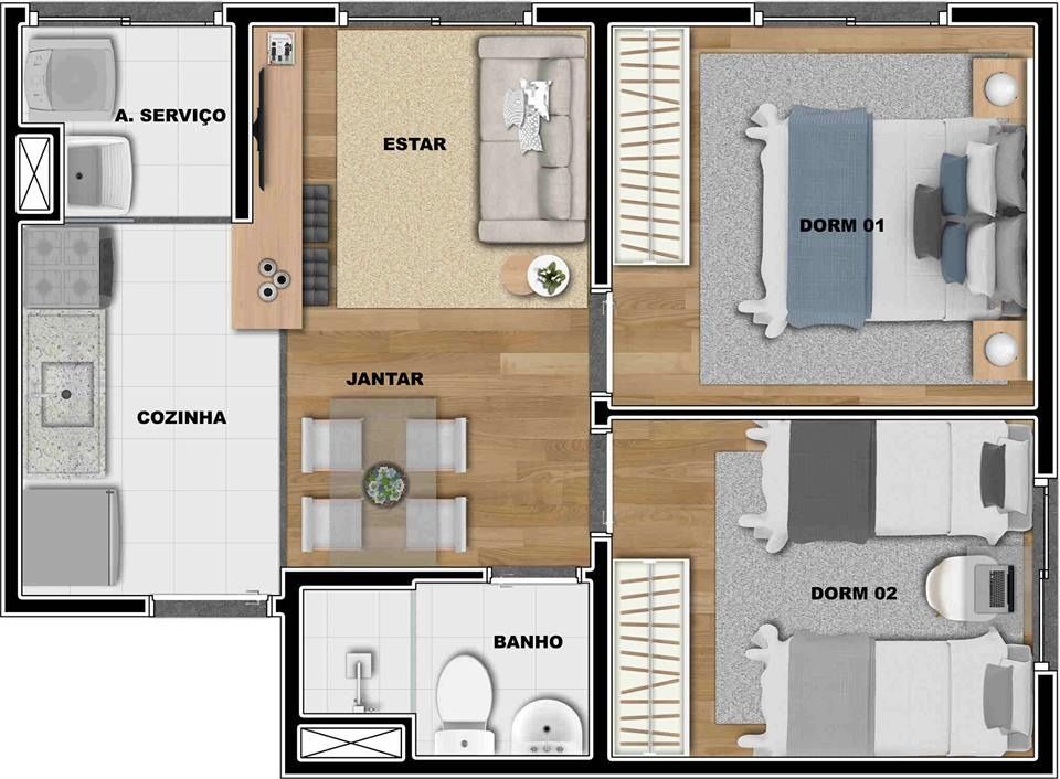- Venha conhecer seu futuro apartamento e descubra como é bom vibrar com a gente, plantas com 38, 42 e 44 m² 2 dormitórios com ou sem vaga de garagem.